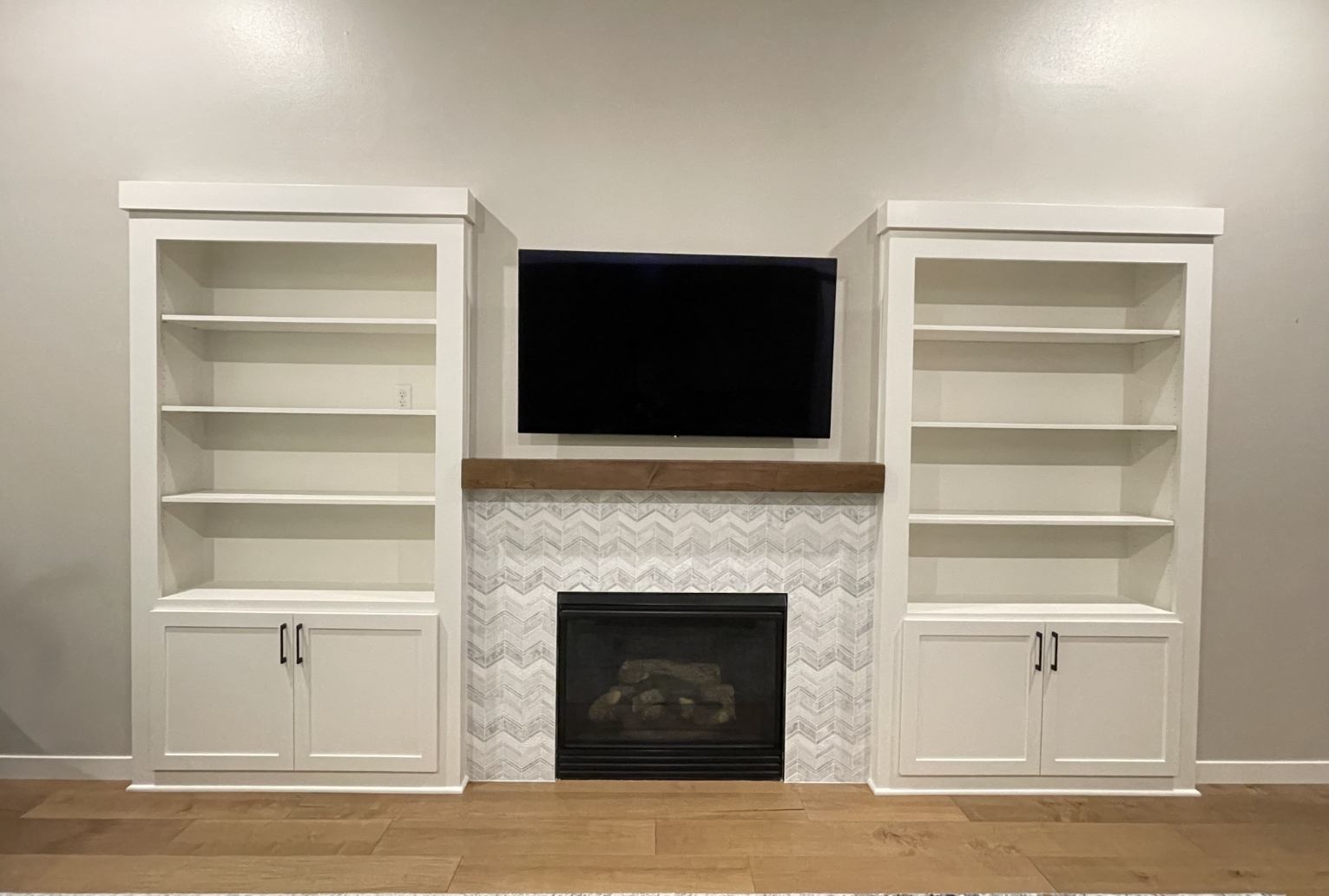 New floors on main floor. New cabinet doors, boxes & paint. New fireplace tile & new painted entertainment center. No more cherry floors & cabinets!